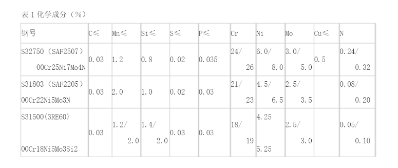 2507(UNSS32750)雙相不銹鋼的強度及抗腐蝕能力較強,主要用于化學加工、石油化工和海底設備。它具有較強的抗氯化物腐蝕能力,較高的導熱性和較低的熱膨脹系數。較高的鉻、鉬及氮含量氏它具有很高的抗斑鐘、裂隨腐鐘及一般腐鐘的能力。它的沖擊強度也很高。2507合金不適宜用在高干570℃的溫度環境下,長期處在這樣的環境下,它的韌性會降低。其化學成分和機械性能如表12所示。
